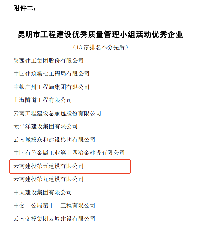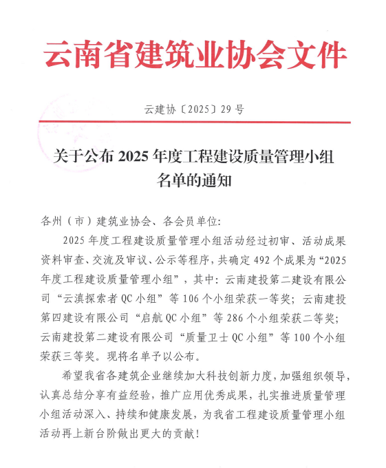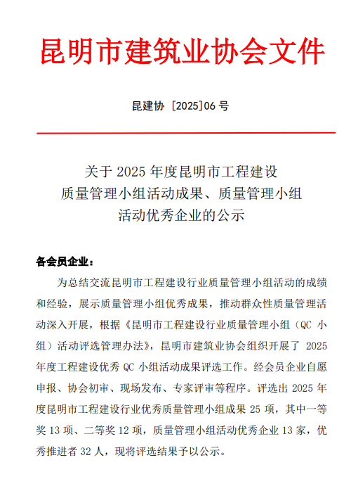 技術(shù)支持: 方森科技近日,云南省建筑業(yè)協(xié)會(huì)、昆明市建筑業(yè)協(xié)會(huì)相繼公布2025年度工程建設(shè)優(yōu)秀質(zhì)量管理小組成果評(píng)選結(jié)果,公司共8項(xiàng)優(yōu)秀QC成果獲獎(jiǎng),其中云南省建筑業(yè)協(xié)會(huì)一等獎(jiǎng)2項(xiàng),二等獎(jiǎng)1項(xiàng),三等獎(jiǎng)2項(xiàng);昆明市建筑業(yè)協(xié)會(huì)一等獎(jiǎng)1項(xiàng),二等獎(jiǎng)2項(xiàng)。公司獲評(píng)昆明市建筑業(yè)協(xié)會(huì)“工程建設(shè)優(yōu)秀質(zhì)量管理小組活動(dòng)優(yōu)秀企業(yè)”稱(chēng)號(hào)。