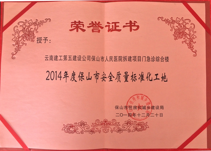 技術(shù)支持: 方森科技 3月27日,保山市住建局組織召開全市建筑業(yè)管理暨工程質(zhì)量安全監(jiān)管工作會議,對2014年度在工程質(zhì)量安全監(jiān)管工作上取得優(yōu)異成績的單位進(jìn)行表彰。其中,由公司第四直管項目部施工的保山市人民醫(yī)院遷建項目被授予“2014年度保山市安全質(zhì)量標(biāo)準(zhǔn)化工地”榮譽(yù)稱號。