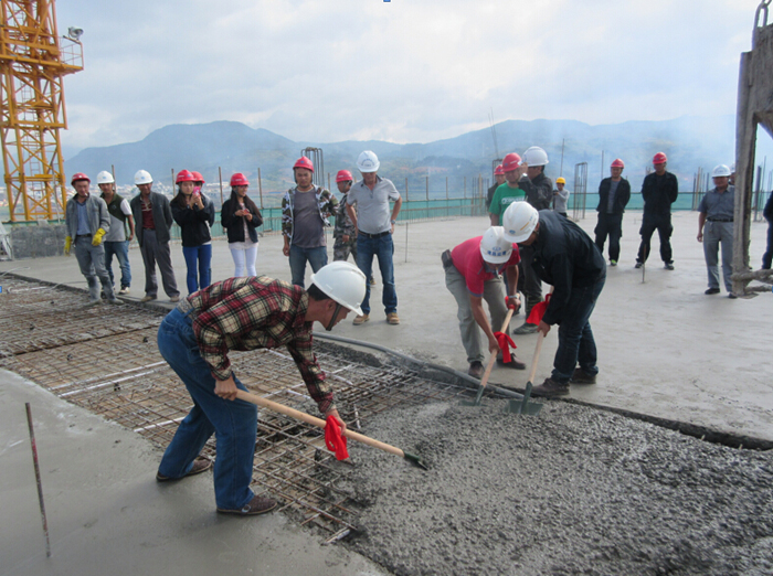 4-4棟教學(xué)樓主樓為五層框架結(jié)構(gòu),附樓兩層框架結(jié)構(gòu),建筑面積為7125.77㎡。在全體管理人員的共同努力下,4-4棟教學(xué)樓率先實現(xiàn)主體封頂斷水,為后續(xù)裝飾裝修工作打下堅實基礎(chǔ)。為了慶祝階段勝利,建設(shè)方部分相關(guān)人員以及施工方管理人員共同參與了封頂儀式。