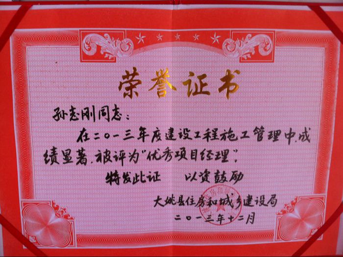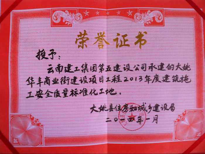 技術(shù)支持: 方森科技 近期,由公司五〇三直管項(xiàng)目部負(fù)責(zé)施工的大姚華豐商業(yè)街建設(shè)項(xiàng)目被大姚縣住房和城鄉(xiāng)建設(shè)局評(píng)為“2013年度建筑施工安全質(zhì)量標(biāo)準(zhǔn)化工地”,擔(dān)任此項(xiàng)目的項(xiàng)目經(jīng)理孫志剛同時(shí)被授予“優(yōu)秀項(xiàng)目經(jīng)理”稱號(hào)。