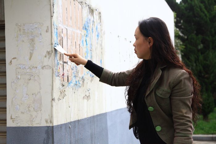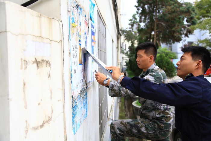 志愿者認(rèn)真的鏟除“牛皮癬”